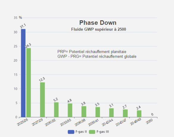 - Il sera interdit d’utiliser des fluides ayant un Potentiel de Réchauffement Planétaire (PRP) supérieur à 2500 dés 2024 (à la date de la promulgation du texte).