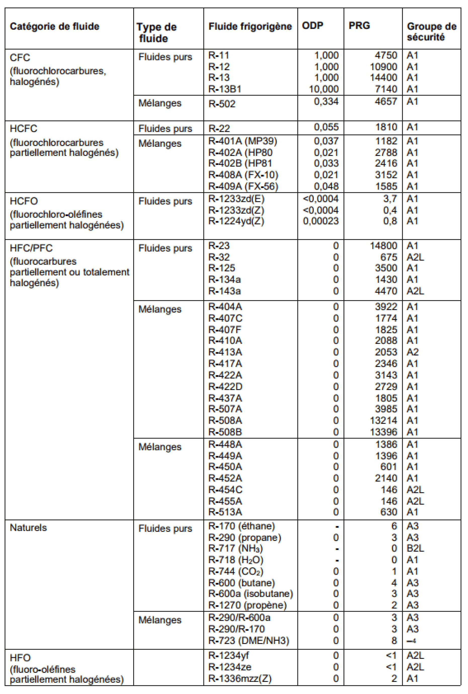 - Les fluides incluent les CFC (interdits), HCFC, HFC, fluides naturels et HFO.